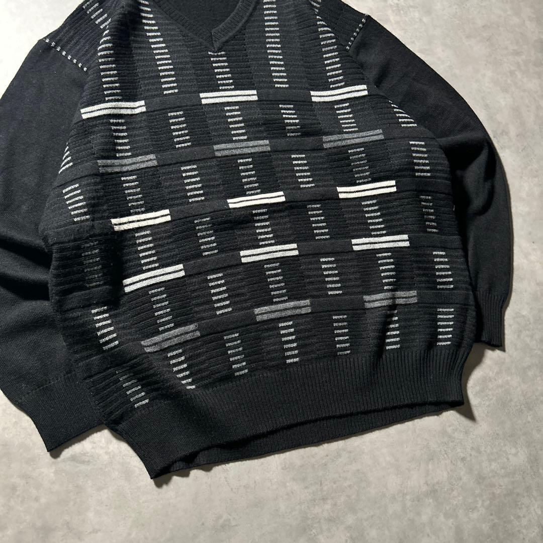 ヴィンテージ BARISAL Vネック 幾何学 模様 モノトーン ニットセーター