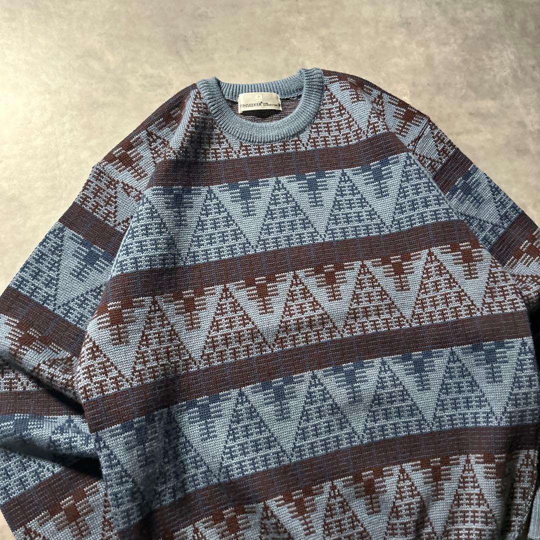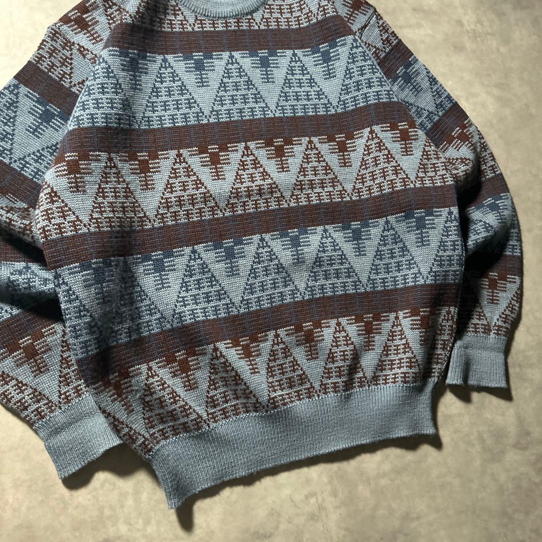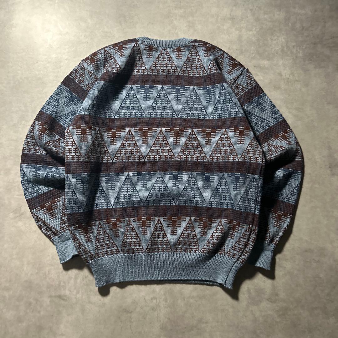 ヴィンテージ ブルー 幾何学 模様 レトロ アートパターン ニット セーター