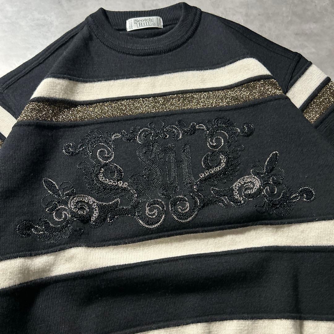 ヴィンテージ ブラック ボーダー 刺繍 ロゴ レトロ デザイン ニット セーター