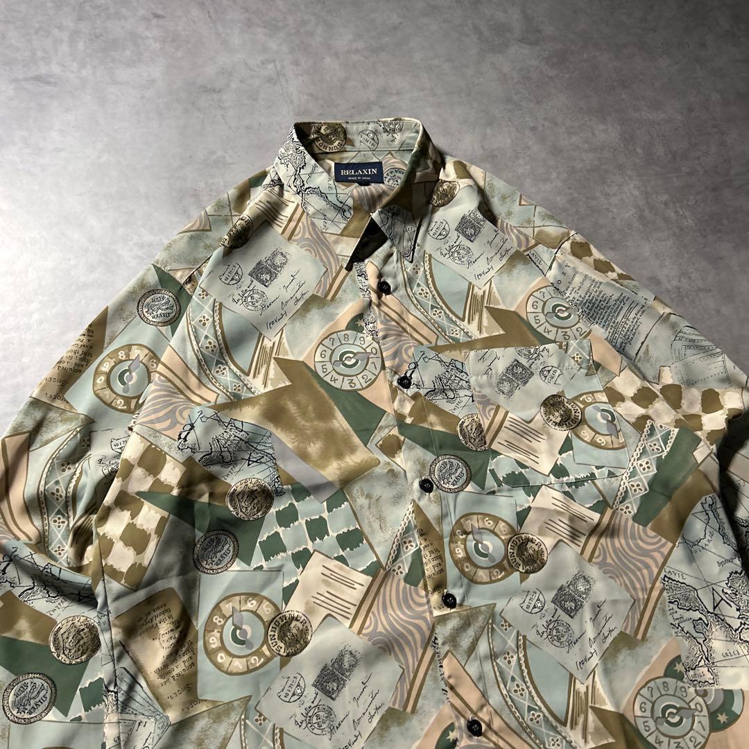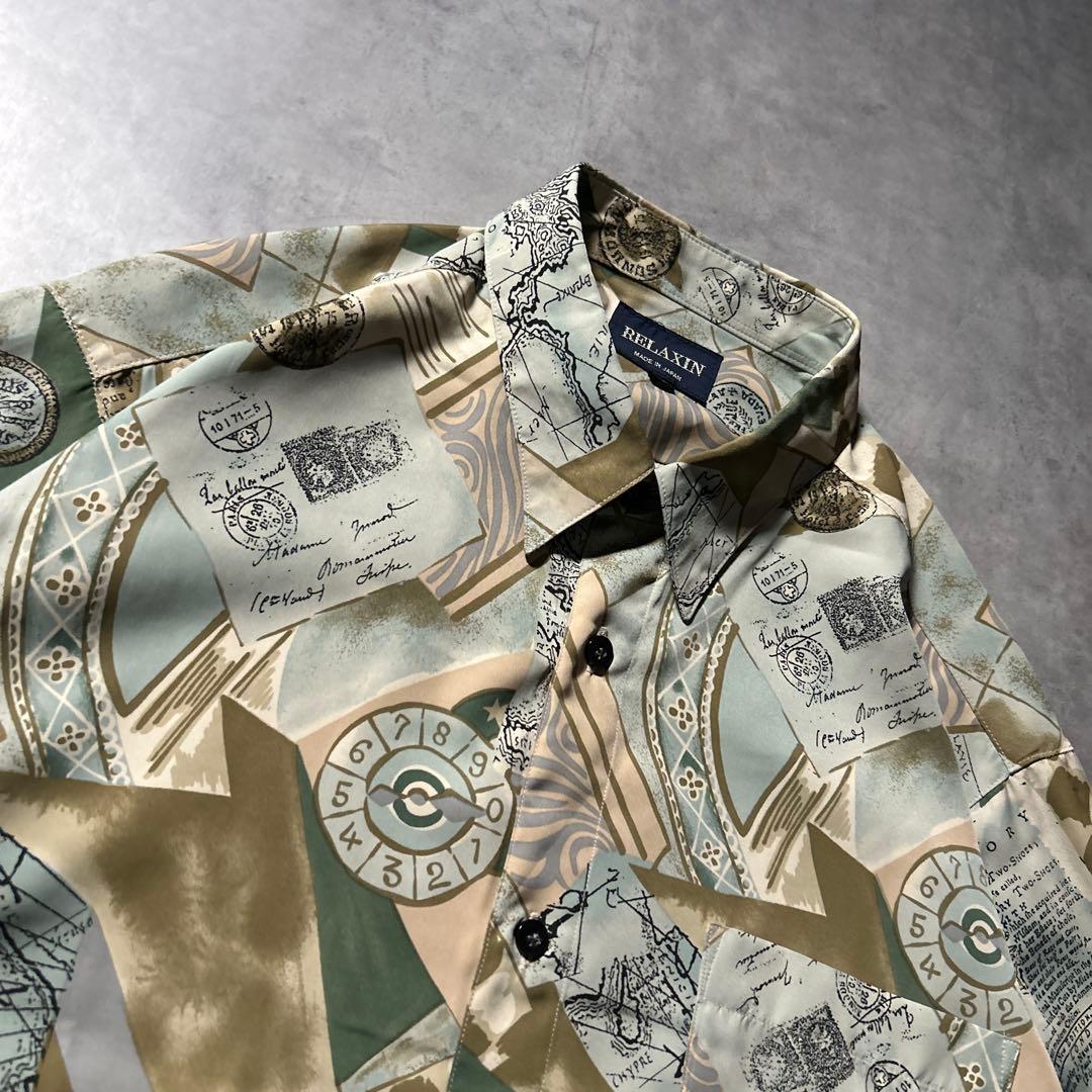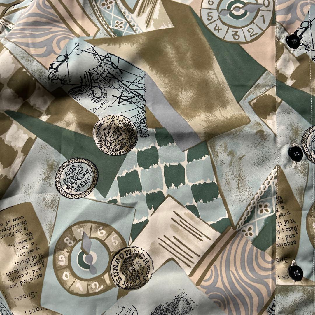 ヴィンテージ グリーン 総柄 幾何学 模様 菅田将暉 レトロ デザイン シャツ